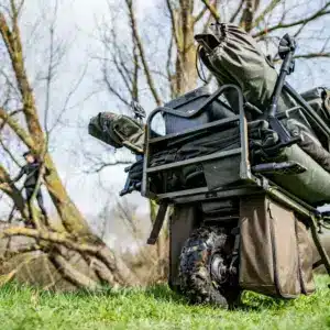 - Zwei mit Metallrahmen verstärkte Fächer an der Außenseite der Räder mit abwaschbaren, wasserdichten Seitenteilen. Für Tackle, Baits und Zubehör.