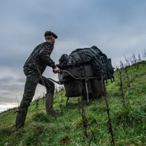 - Ein großes mit Metallrahmen verstärktes Fach, mit einer wasserdichten Unterseite, für Wattstiefel, Kleidung oder andere sperrige Gegenstände