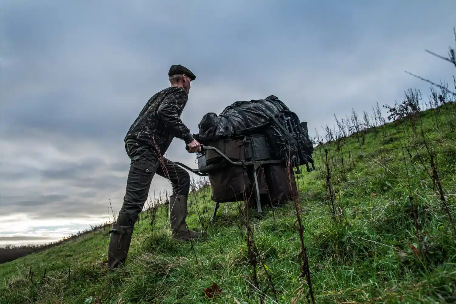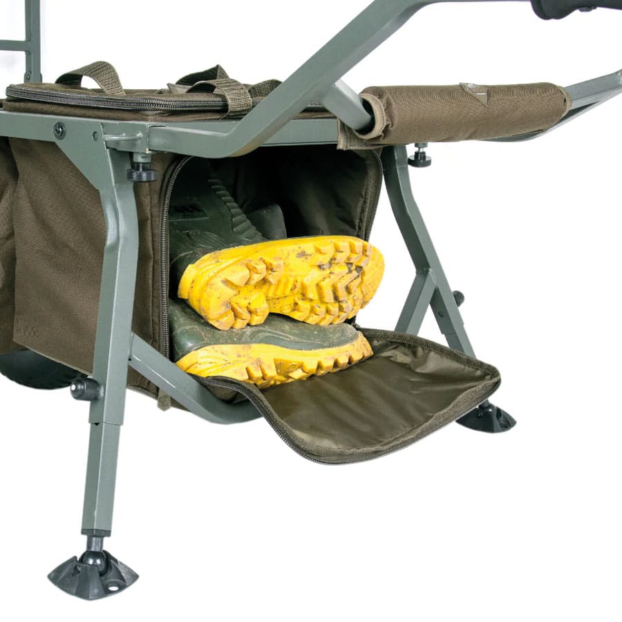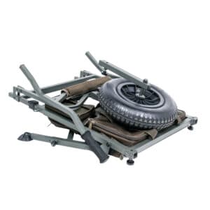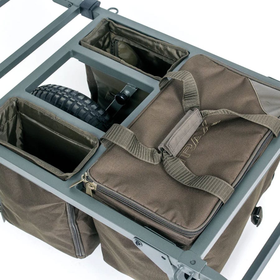 - Zwei mit Metallrahmen verstärkte Fächer an der Außenseite der Räder mit abwaschbaren, wasserdichten Seitenteilen. Für Tackle, Baits und Zubehör.