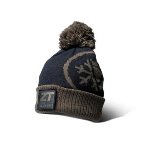 Gefütterte Bommelmütze für extreme Wärme, ausgestattet mit einem abnehmbaren gewebten Front-Patch für zwei verschiedene Tragevarianten.